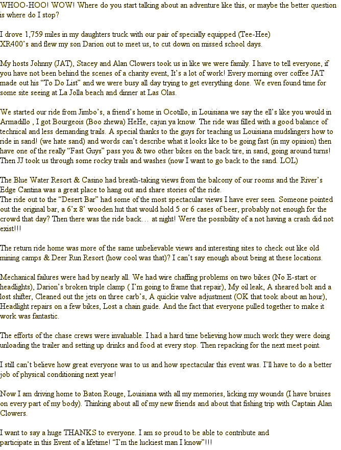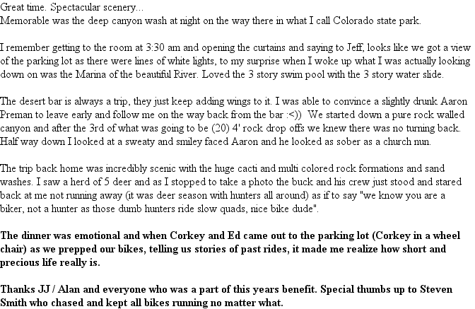 As for the ride, it was Great. Well organized with support teams who met us at every stop with food, drinks, gas and help. Every one of them were so positive and gave so much. On the ride, Johnny led us with challenging and fun trails and terrain. He made sure the top riders were challenged while trail riders were encouraged and helped. I loved Sunday mornings ride with its winding and cambered trail, while I survived the rough and rugged rock garden. All in all, a great time and wonderful event.