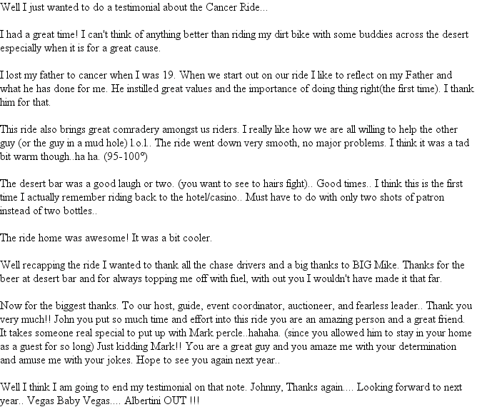What an adventure, and all for a great cause, too! The riding was excellent and quite varied as far as desert type terrain is concerned, and that was nice. It seemed like there was always something to keep you on your toes and the smooth easy sections were a nice break, especially with the heat.